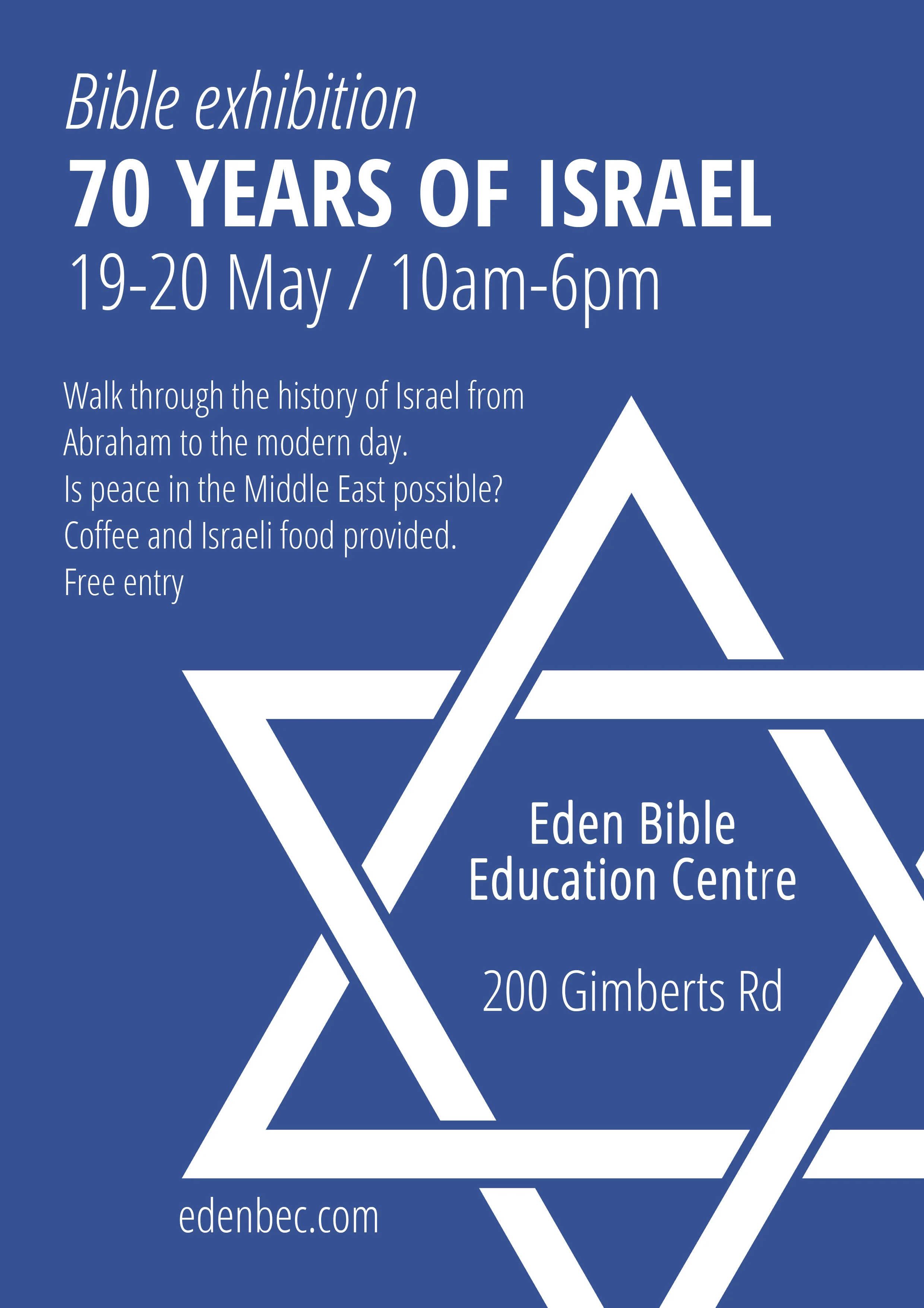 A 2 day exhibition on 19-20th May, followed by a movie viewing "I Am Israel" and a short talk on Wednesday 23rd May 7pm at Eden Bible Education Centre. For those wanting further information- there is a seminar entitiled 'How Will It All End' at Warners Bay Performing Arts Centre, Saturday 26th May at 2.30 pm and 4 pm.